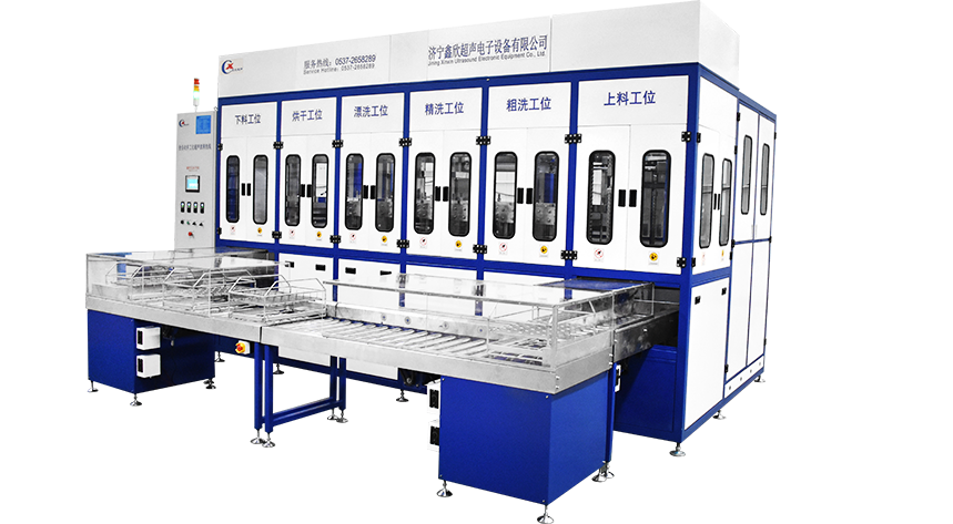 該設(shè)備有上下料網(wǎng)帶、超聲波清洗工位、噴淋漂洗工位、高壓風(fēng)切、熱風(fēng)烘干工位、溫控水加熱系統(tǒng)、風(fēng)機(jī)、溫控空氣加熱系統(tǒng)、移動(dòng)式風(fēng)刀、PLC+觸摸屏控制系統(tǒng)、管路系統(tǒng)及智能電器控制系統(tǒng)等組成。自動(dòng)進(jìn)排液和自動(dòng)